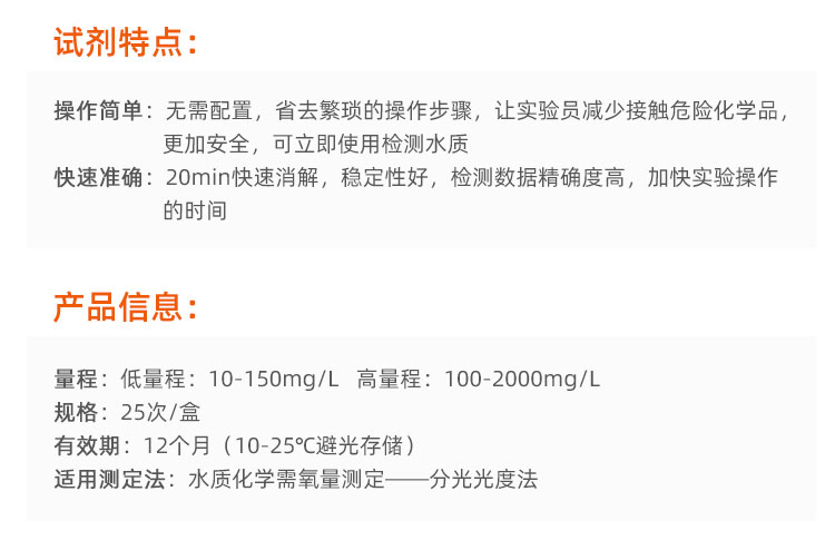 檢測范圍:低量程:10-150mg/L 高量程:100-2000mg/L