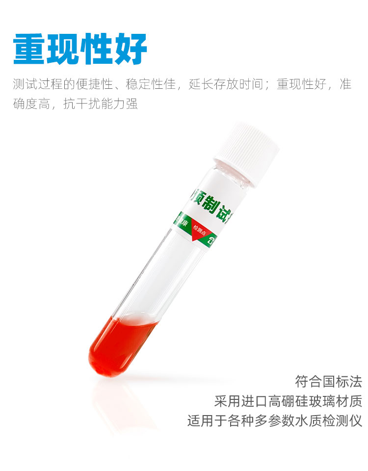 測試過程的便捷性、穩(wěn)定性佳,延長存放時(shí)間;重現(xiàn)性好,準(zhǔn)確度高,抗干擾能力強(qiáng),采用進(jìn)口高硼硅玻璃材質(zhì)適用于各種多參數(shù)水質(zhì)檢測儀,作為綠色試劑,減少接觸化學(xué)危險(xiǎn)品的機(jī)會,確保操作人員的身體健康