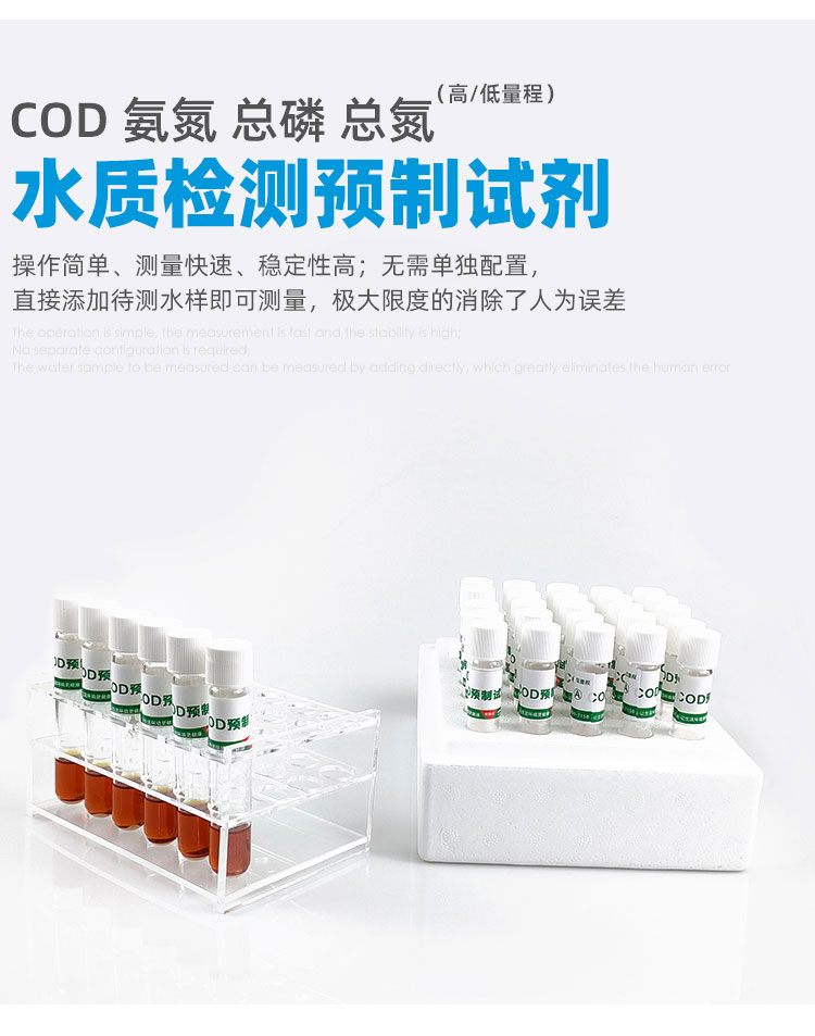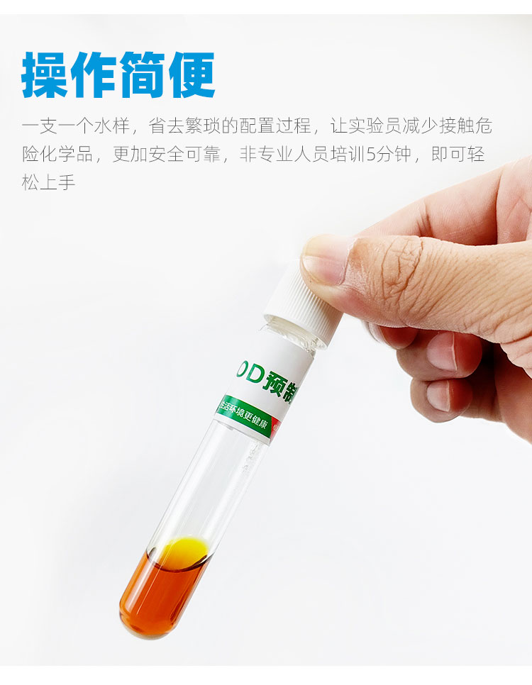一支一個水樣,省去繁瑣的配置過程,讓實(shí)驗(yàn)員減少接觸危險(xiǎn)化學(xué)品,更加安全可靠,非專業(yè)人員培訓(xùn)5分鐘,即可輕松上手