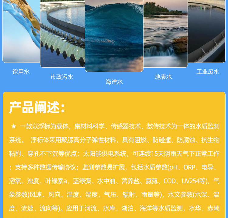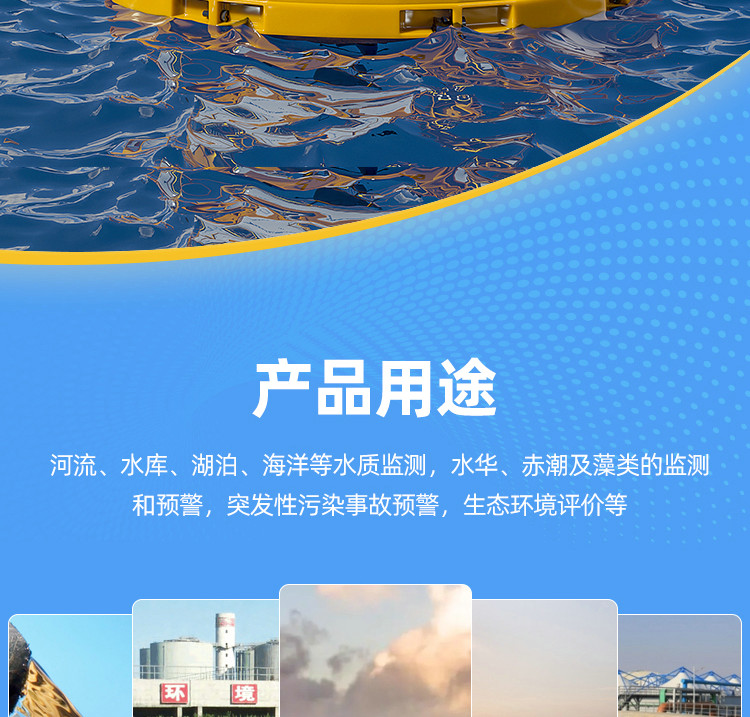 海洋浮標水質監(jiān)測站可應用于海洋(河流、水庫、湖泊等)水質監(jiān)測,水華、赤潮及藻類的監(jiān)測和預警,突發(fā)性污染事故預警,生態(tài)環(huán)境評價等。