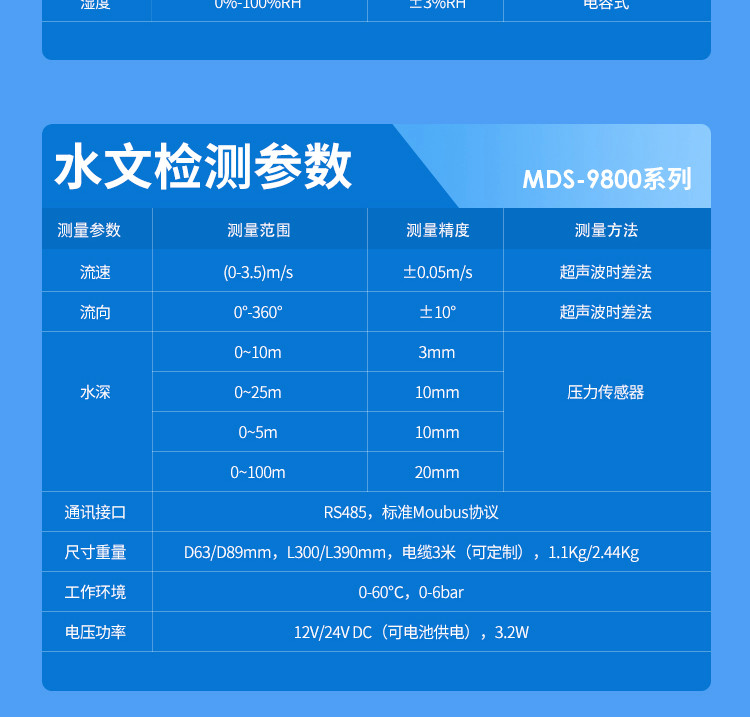 | 水深 | 壓力傳感器 |  (0-10) m(0-25)m (0-50)m (0-100)m  | 3mm 10mm 10mm 20mm  |