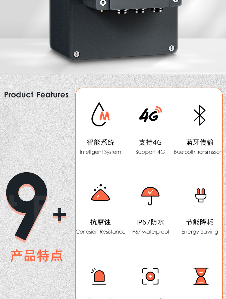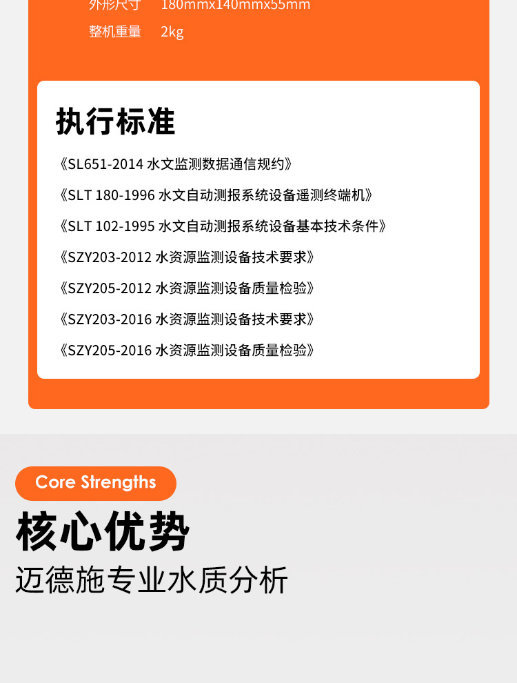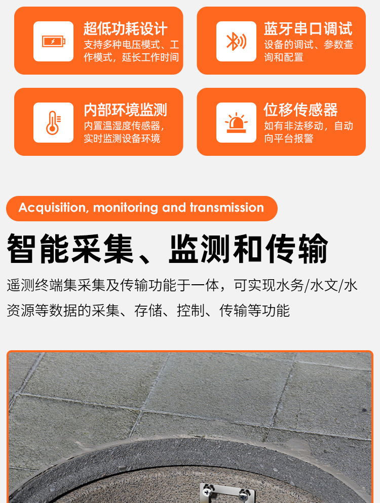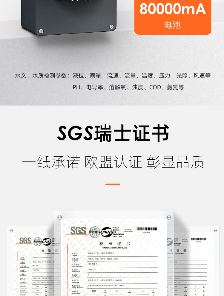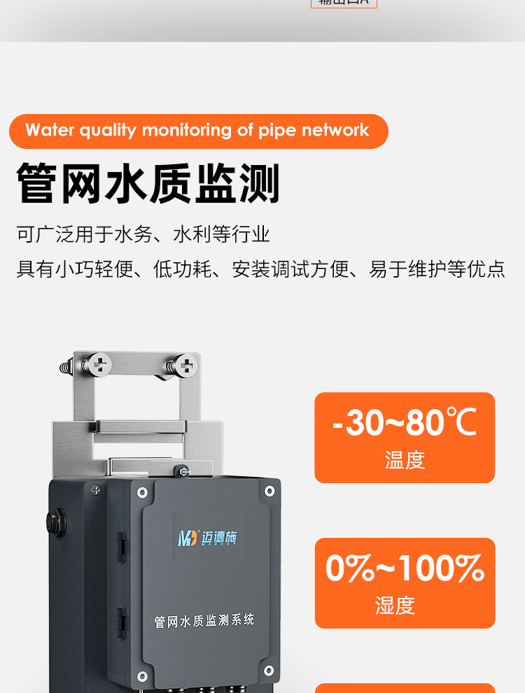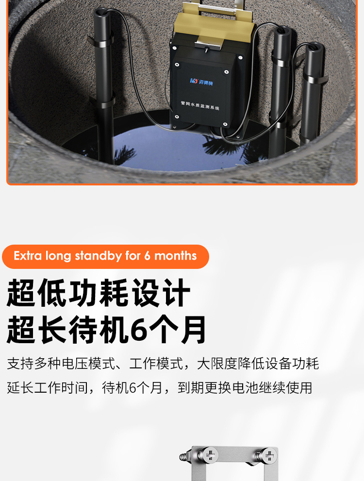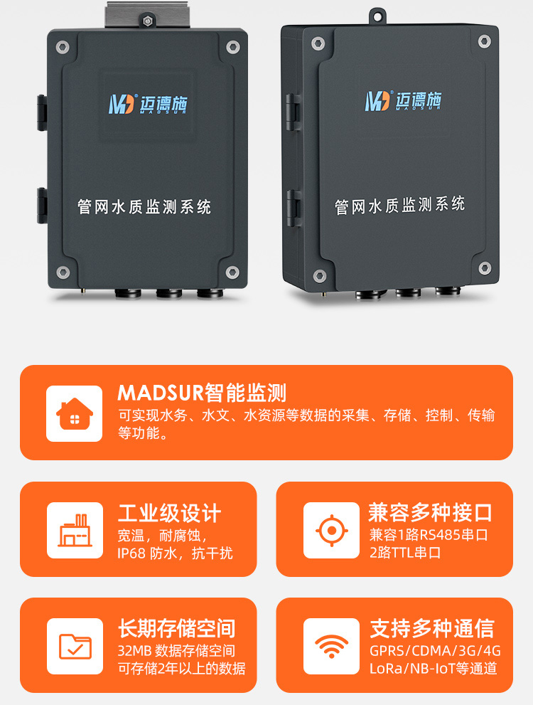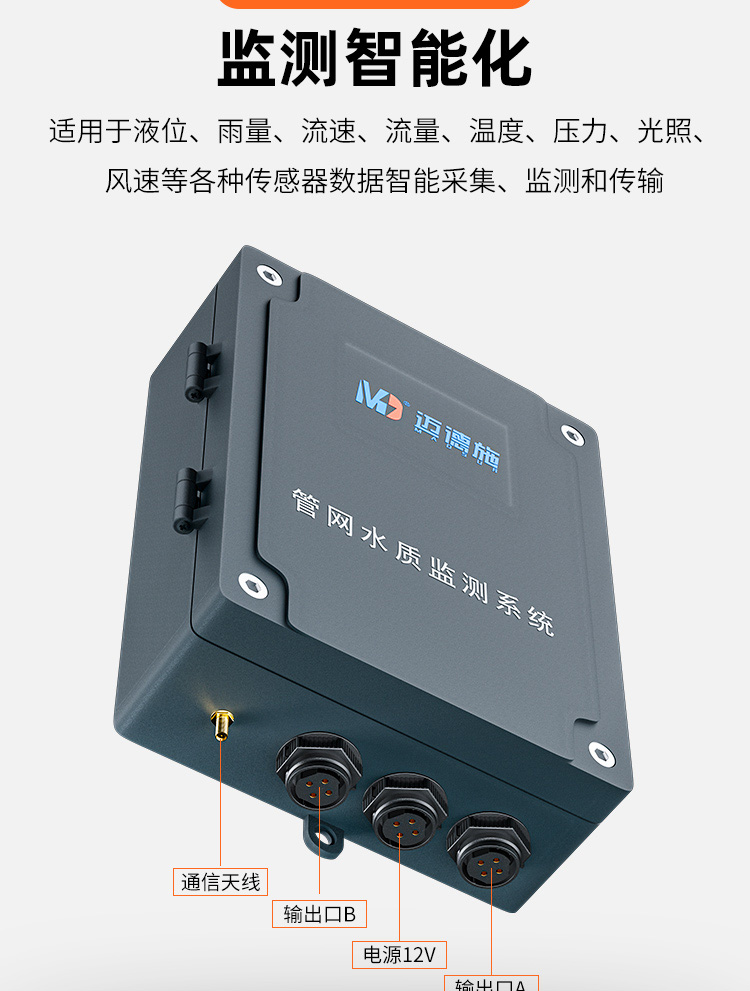 產(chǎn)品概述MDS-GW100地下管網(wǎng)水質(zhì)監(jiān)測系統(tǒng),集監(jiān)測電極、供電電源、數(shù)據(jù)傳輸、系統(tǒng)控制于一體,便于客戶使用安裝維護。監(jiān)測電極可自由組合PH、電導(dǎo)率、溶解氧、濁度、COD、氨氮、葉綠素、藍綠藻、水中油等多個因子。內(nèi)置高容量鋰電池,給監(jiān)測電極、控制系統(tǒng)、數(shù)據(jù)傳輸模塊供電,采用節(jié)能模式電池可用6個月時間。數(shù)據(jù)傳輸模塊可選4G、CDMA、BD等方式,上傳至指定平臺。控制模塊可設(shè)置節(jié)能模式,可設(shè)置、校準電極。 應(yīng)用范圍可實現(xiàn)水務(wù)、水文、水資源等數(shù)據(jù)的采集、存儲、控制、傳輸?shù)裙δ堋?/p> 適用于液位、雨量、流速、流量、溫度、壓力、光照、風(fēng)速等各種傳感器數(shù)據(jù)智能采集、監(jiān)測和傳輸。 可廣泛用于水務(wù)、水利等行業(yè)。 可應(yīng)用于污水管網(wǎng)監(jiān)測、雨水管網(wǎng)監(jiān)測、供水管網(wǎng)監(jiān)測等。 功能特點1、靈活協(xié)議:可標準可定制,支持多功能——Modbus 協(xié)議。 2、兼容多種接口:兼容1路RS485串口、2路TTL串口2路模擬量輸入接2口、2路開關(guān)量輸入接口、2路開關(guān)量輸出接口等。 3、長時間存儲空間:提供32MB數(shù)據(jù)存儲空間,可存儲2年以上的標準采集數(shù)據(jù)。 4、支持多種通信:支持 GPRS/CDMA/3G/4G /LoRa/NB-IoT等傳輸通道。 5、超低功耗設(shè)計:支持多種電壓模式、工作模式,最大限度降低設(shè)備功耗,延長工作時間。 6、藍牙串口調(diào)試:藍牙模塊用于設(shè)備的調(diào)試、參數(shù)查詢和配置。 7、開關(guān)機:使用磁開關(guān)非接觸式開關(guān)機、提高可靠性和降低功耗。 8、內(nèi)部環(huán)境監(jiān)測:內(nèi)置溫濕度傳感器,實時監(jiān)測設(shè)備環(huán)境。 9、位移傳感器:如有非法移動,自動向平臺報警。 技術(shù)參數(shù)供電電壓:DC3-5V或者DC12V-24V 低壓保護:11.1/22.2V(保護電池) 高壓保護:16.0/32.0V 平均功率:≤3.3V/50mA或 ≤12V/100mA 靜態(tài)功耗:≤3.3V/1mA或 ≤12V/10mA 溫濕度:內(nèi)置溫濕度傳感器 無線通信:支持NB/4G/2G/3G/LORA通信 藍牙通信:APP設(shè)置、查詢參數(shù) 溫度:-30~80℃ 濕度: 0%~100%RH 防護等級:IP68 殼體材質(zhì):合頁型鑄鋁防水盒 外形尺寸:180mm×140mm×55mm 整機重量:2kg