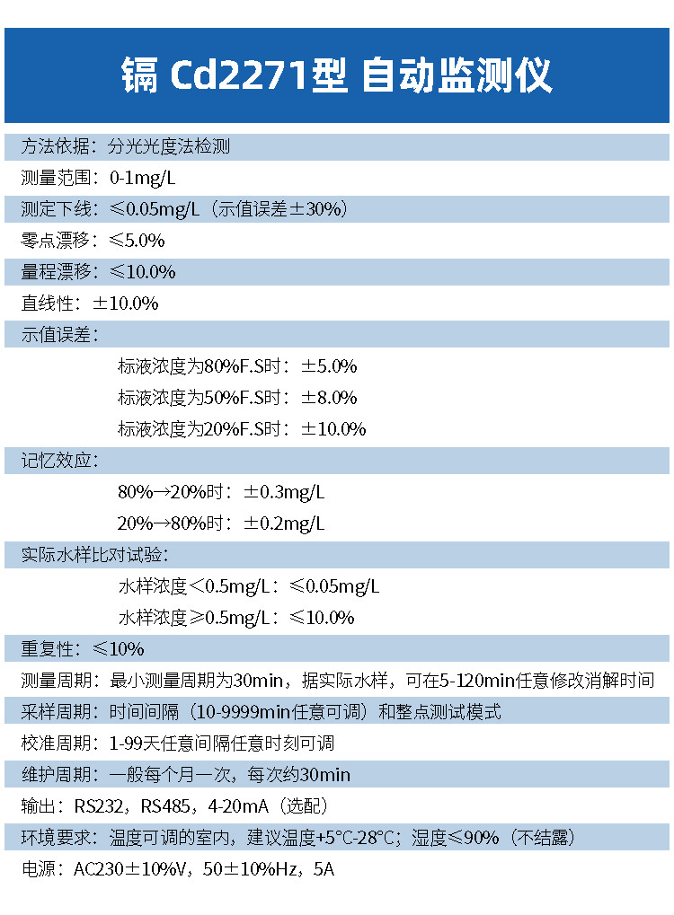 儀器概述 CD-2271在線總鎘檢測儀是一款用于實時監測水體或液體中總鎘(Cd)含量濃度的水質監測分析儀器。該款檢測儀能夠自動采集樣品、進行分析、記錄數據,并根據預定的閾值觸發警報或控制其他設備以維持水質合規,廣泛用于工業廢水處理、環境監測、飲用水處理、金屬冶煉和其他領域。 監測原理 CD-2271在線總鎘檢測儀的監測原理基于分光光度法。首先,取待檢液體鎘樣品,加入光敏染料雙酚A和緩沖液,調整樣品的酸性條件至pH 4.5~5.5之間。在這種酸性條件下,鎘離子與雙酚A形成紅色絡合物。然后,將該絡合物進行過濾,并利用分光光度計在最大吸收波長(540nm處)測量其吸光度。最后,根據預先建立的鎘標準曲線,通過吸光度值計算出待檢樣品中鎘的濃度。 應用行業 CD-2271在線總鎘檢測儀適用于飲用水、工業廢水、農田灌溉水等各類水體中的重金屬總鎘含量濃度監測。 儀器特點 ● 試劑使用量小于1mL/次,消耗量少節約成本,維護簡單方便。 ● 無需擔心后期維護問題,試劑配方公開,可自行配置。 ● CD-2271在線總鎘檢測儀可遠程控制加標、參數設置、儀器校準參數記錄和異常報警。 ● 可無人值守全自動完成校正、取樣、配液、測量、清洗計算和數據傳輸等全部流程。 ● 機電部件技術先進,全部采用先進的電器零部件自動、手動校準,整點、間隔做樣,周期可設定,量程自動切換。 ● 創新的機箱設計,試劑瓶上置消除負壓對試劑采樣的影響及氣泡產生,縮短進樣時間,提高測定效率及準確性。 ● 高精度順序注樣閥,可實現高集成多通道準確選向與切換功能,結構簡潔,功能強大;順序注射定量環技術及液位檢測系統,進樣量精準,并具有自動擴大測量范圍數倍的功能。 ● 試劑廢液和清洗廢液分開收集,大大減少處理有毒試劑的費用,更環保。