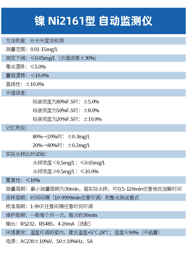 產品概述 在線鎳檢測儀是一種用于實時監測水體或廢水中鎳(Nickel)濃度的儀器。它在工業、環境監測和水資源管理中發揮著重要作用。 工作原理 水樣和調節劑混合后,鎳離子在氨性環境和指示劑存在的情況下,與指示劑反生成一種帶色絡合物,分析儀檢測此顏色的變化,并把這種變化換算成鎳離子值輸出來。生成的帶色絡合物量相當于鎳離子量。 技術參數 方法依據:分光光度檢測 量程:0.01-15mg/L 測定下線:≤0.05mg/L(示值誤差±30%) 零點漂移:≤5.0% 量程漂移:≤10.0% 重復性:≤10% 直線性:±10.0% 示值誤差: 標液濃度為80% F.S時:±5.0% 標液濃度為50% F.S時:±8.0% 標液濃度為20% F.S時:±10.0% 記憶效應 80%→20%:±0.3 mg/L 20%→80% :±0. 2 mg/L 實際水樣比對試驗 水樣濃度<0.5mg/L:≤0.05 mg/L 水樣濃度≥0.5 mg/L :≤10.0% 測量周期:測量周期為30分鐘,據實際水樣,可在5~120min任意修改消解時間 采樣周期:時間間隔(10~9999min任意可調)和整點測量模式。校準周期:1~99天任意間隔任意時刻可調 維護周期:一般每月一次,每次約30 min。輸出:RS-232,RS-485,4-20mA(選配) 環境要求:溫度可調的室內,建議溫度+5~28℃;濕度≤90%(不結露) 電源:AC230±10%V,50±10%Hz,5A 儀器特點 具有自動標準樣品核查功能異常報警和斷電不會丟失數據; 具備對不同測試數據添加標識功能。 能實現監測數據的串口輸出與網口輸出。 具有分析廢液和清洗廢水分別收集存放的功能。 具有多個量程并能自動切換量程,儀器顯示測試結果 具有大容量存儲,不低于5年歷史數據保存《測量周期1h/次) 異常復位和斷電后來電,儀器自動排出儀器內殘留反應物,自動恢復工作狀態。 具有對所有數據、儀器參數及運行日志自動采集、存儲、處理、查詢、顯示和輸出功能。 選擇閥組件,選擇試劑采樣時序,通道靈活多樣,具有易維護高壽命等優點。 具有具有數字量通訊接口,通過數字量通訊接口輸出指令、相關數據及運行日志,并可接收管理平臺的遠程控制指令,包含遠程啟動、遠程對時等功能。